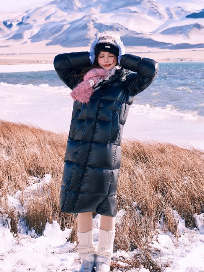 在蒙口羽绒服底下搭配短裙,同期配上一对长筒靴,增多膝盖以上、大腿以下的露肤面积,显瘦显腿长,举座造型也看着更洋气。