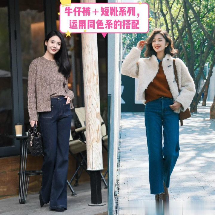 这么的组合搭配当中,念念要将措施的比例彰显出来,那么比较要道的就是你所搭配的上衣是若何的,优先于聘任诈欺短款的系列,又或者是纠合偏向于长款的外搭,纵向来看的话是有着相配显豁的拉伸力度的。但要是你的牛仔裤和短靴是妥洽色系的话,那么你的上衣以及外搭系列就最佳大要与它们是对比的激情。