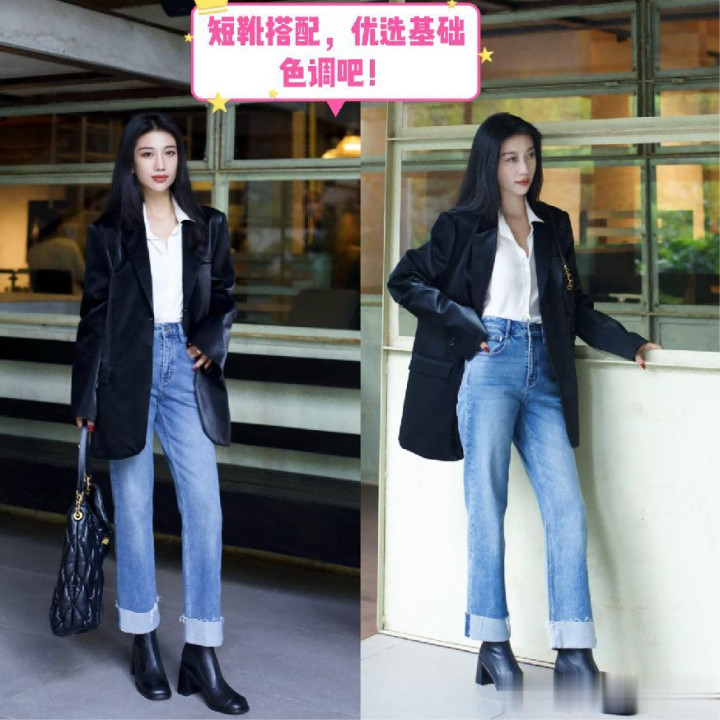 靴子这一类的单品,无论是搭配什么样的下半身进行诈欺,皆提议诸君一定要聘任基础的色彩,举例像是非灰,又或者是地面色系,在秋冬季节的时代,其实是动作透澈优选的存在。不要去果敢的尝试一些彩色彩,否则所映衬出来的遵循,即便你是搭配了很百搭的牛仔裤也莫得任何的视觉上风可言。