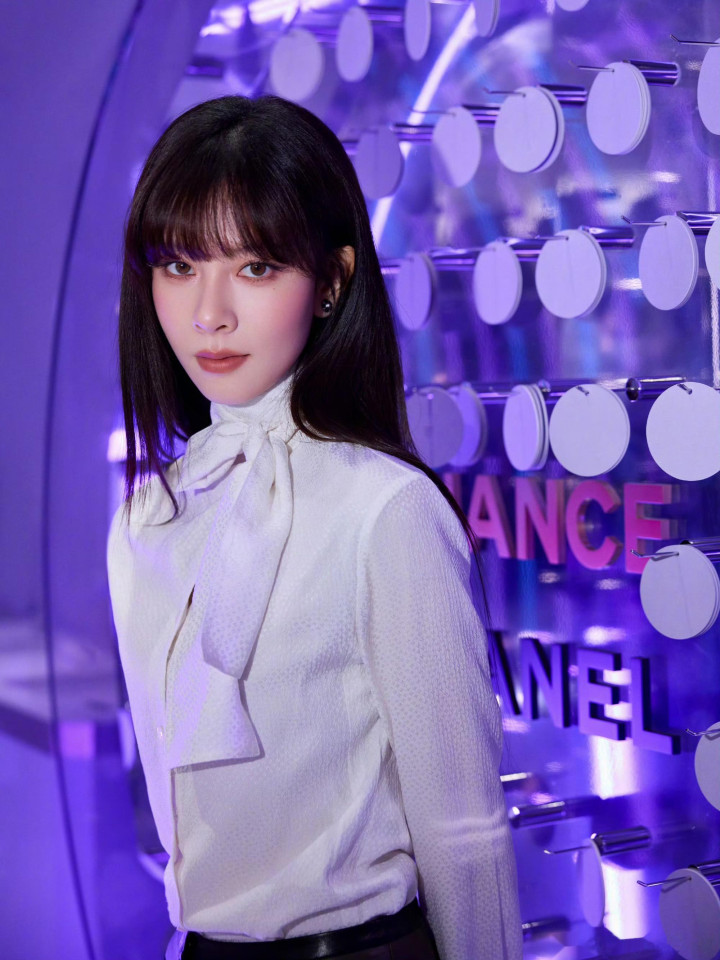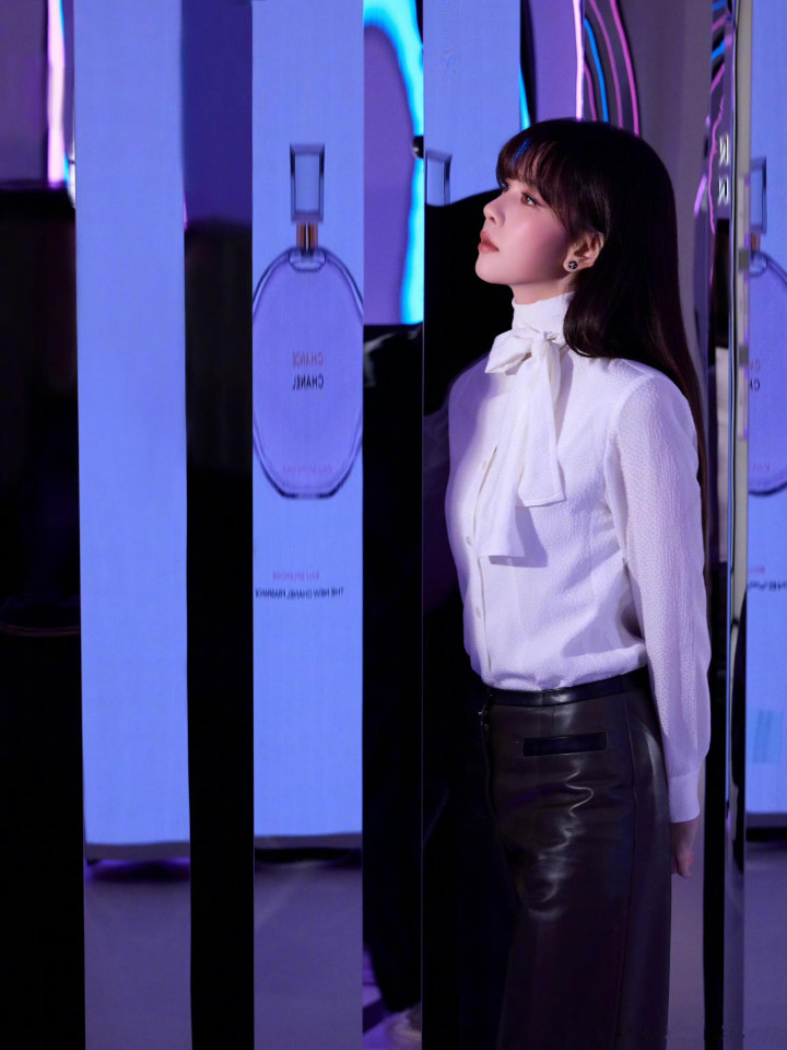 当白色飘带衬衫遇上玄色皮质半裙,宋妍霏便化身齐市里的温婉佳东谈主。领口的飘带随呼吸轻晃,垂顺的长发与轻柔的眉眼神乎其神。