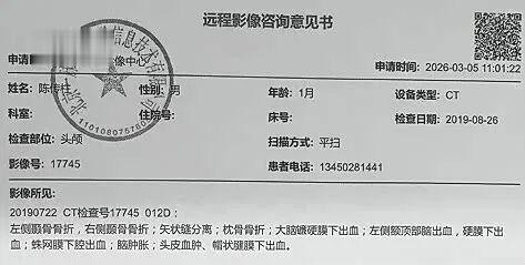 2019年7月22日,病院拍摄了孩子的头颅CT影像,炫耀双侧顶枕部软组织肿胀。珠江病院影像科医师胡培铅的判断是:接洽硬膜下及蛛网膜下腔积血;接洽髓鞘发育未饱胀;双侧顶枕部软组织肿胀。