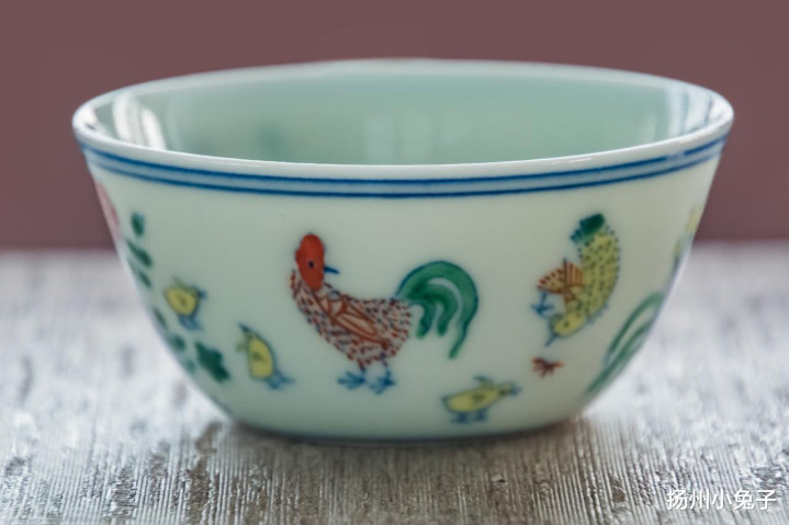 鸡缸杯,具有青花和斗彩两种瓷器身分,烧制极其障碍。万贵妃可爱工致的瓷器,成化帝为了讨万贵妃欢心,不吝东谈主力物力烧制。“小鸡食米图”的画面,有一种老母鸡护雏的意味吧。