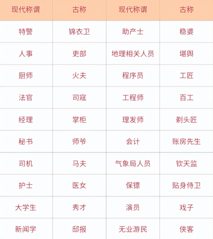 你的职业在古代叫什么呢?淌若上头莫得先容到,底下再给大师一个节略表格,大师不错比对下,仅供文娱消遣。