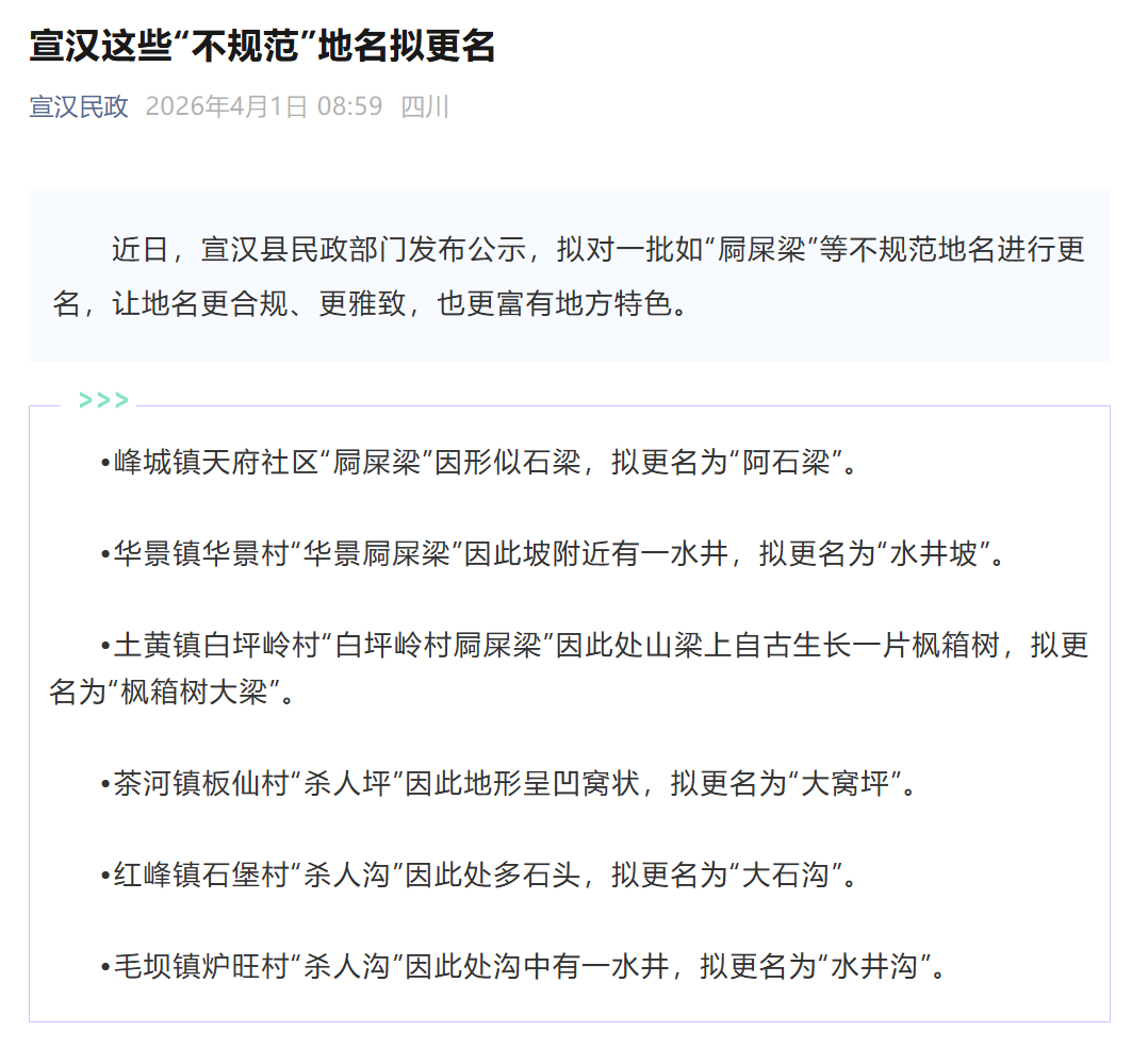 近日,四川省内多个县市的地名“整容”职责激发时势。达州市宣汉县、万源市等地民政部门接踵发布公示,对一批如“杀东说念主坳”“屙屎梁”等不步骤地名进行改名,让地名更合规、更斯文,也更富饶方位脾气。