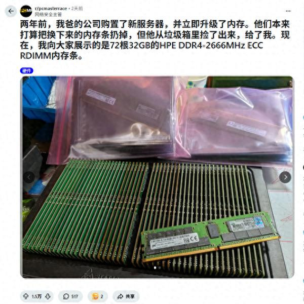 Reddit PC硬件社区r/pcmasterrace的网友cyberchief发帖称:“2 年前(2024年),我爸的公司买了新就业器,得手坐窝就升级了内存。换下来的原厂内存条底本要被丢进垃圾桶,我爸把它们从垃圾堆里救了追思,交给了我。给各人望望,72条HPE 32GB DDR4-2666MHz ECC RDIMM内存。”