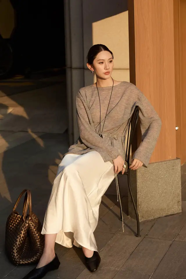 Tips②:浅灰色毛衣搭配玄色半身裙
