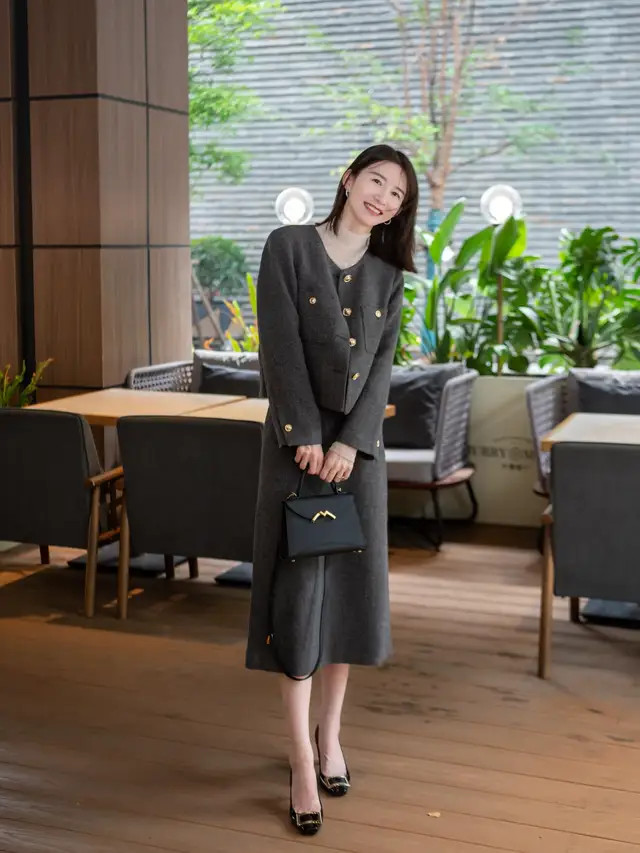 挂念我方不太会打扮出错的情况下,我们成功选定套装,即是整套衣服成功穿在身上,基本上就不错裁汰出错率了。举例上头这一套灰色的。小香风裙装内搭白色的半高领赤诚毛衣,脚穿一对玄色的浅口高跟单鞋,这样的打扮穿去上班,逛街,约聚,外出旅游,拍照齐莫得任何问题,通勤又时髦。