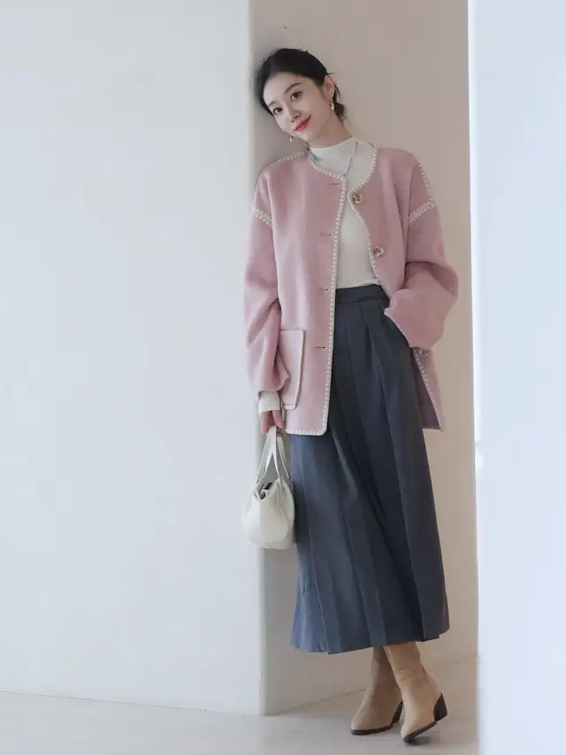 就像上头这位前锋博主,就选定了一件粉色的小香风外衣,内搭御寒又温顺的白色赤诚毛衣和一条灰色的压褶半身裙,裙长过膝不外脚踝,脚踩着一对地面色系的中筒靴,变成了“裙中靴”穿搭造型,是当下比拟流行的一种穿法。