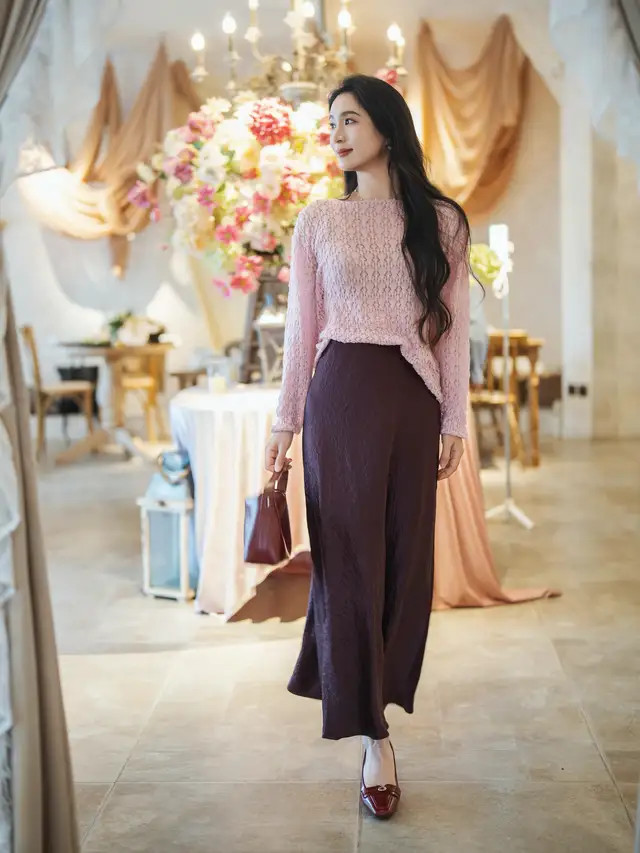 驯顺莫得哪个女生能拒却得了上头这一件粉色的毛衣。粉色毛衣穿在身上就能修饰肤色,让你显白显嫩更显年青。这位博主成功选定了一条棕紫色的半身裙来组合,脚穿一对红色的浅口低跟单鞋,连合大波涛的鬈发造型,懒散出来的气质更有女神范了。