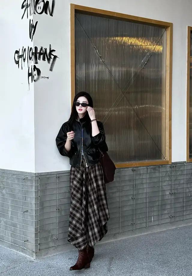 念念让我方打扮低调又洋气的情况下,不错选定一条永别称蓄意的格纹半身裙来穿搭,上衣如故一件玄色的皮衣外衣,脚穿一对棕红色的短靴。这样的打扮很允洽 00 后的好意思青娥,外出旅游拍照罕见出片。