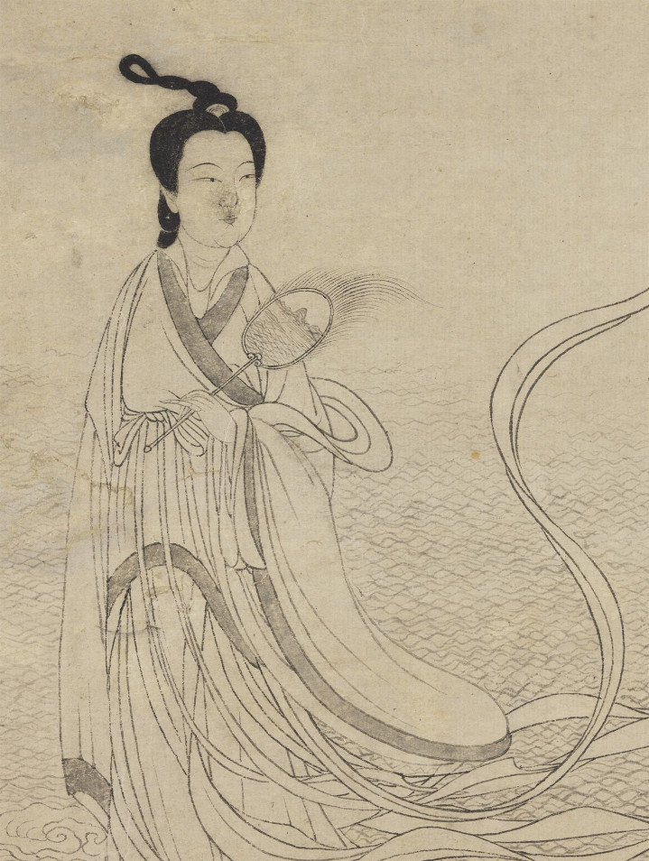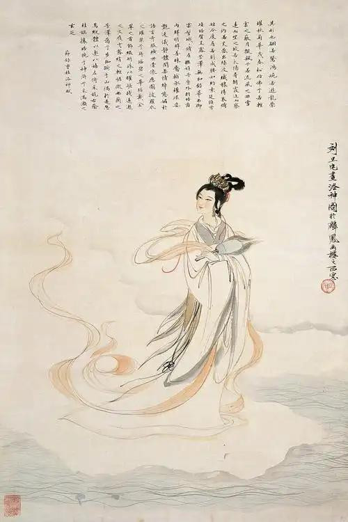 画中的洛神站在水波之上,以 45 度斜角站姿微微侧身,回眸一排。