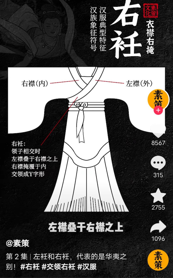 “衽”等于衣襟。右衽,指左边的衣襟压在右边之上,这是中国汉族传统衣饰的基本形制。何如连女神都“穿错了”?