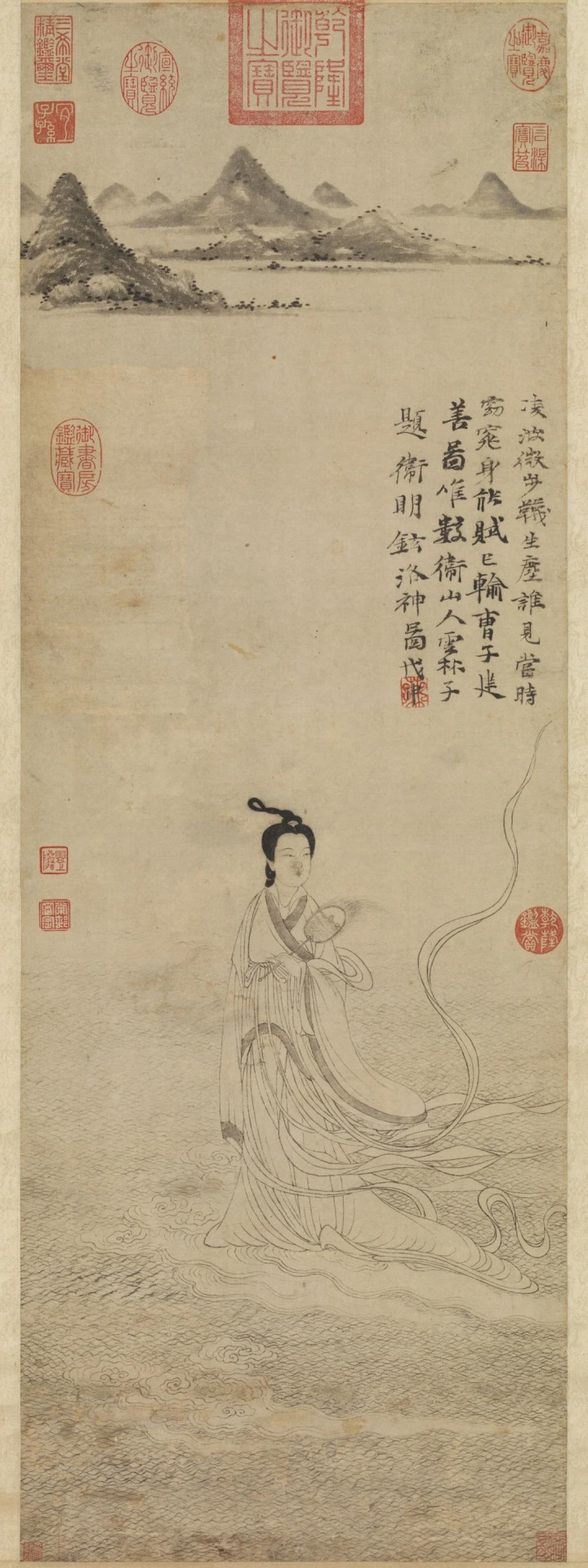 提及“国民女神”,洛神必有立锥之地。但要画好洛神却蹂躏易,因为她的阴凉中又带有吸引,腾贵中又有亲近,这不是一般画家不错独霸得来的。是以,古代绘制作品中,画洛神的名作未几,除了顾恺之的《洛神赋图》,接下来等至今天要给人人先容的元代画家卫九鼎的《洛神图》了。