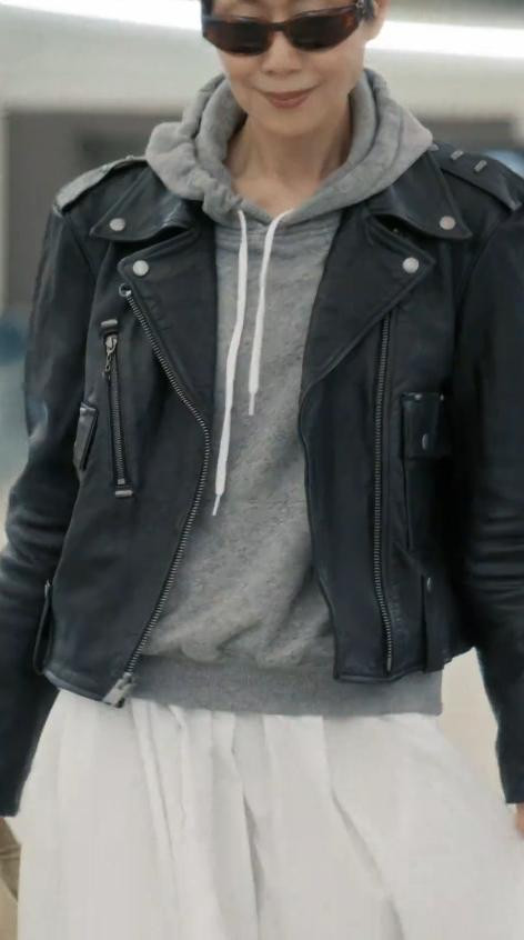 视频中的叶女士上身衣着一件短款的玄色皮夹克,外衣的内部则是一件灰色的短款连帽卫衣,上头有着两根白色的带子。