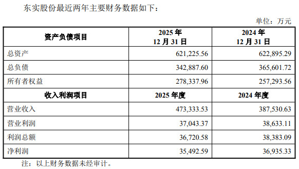 2024年度、2025年度,东实股份贸易收入区分为387,530.63万元、473,333.53万元,净利润区分为36,935.33万元、35,492.59万元。