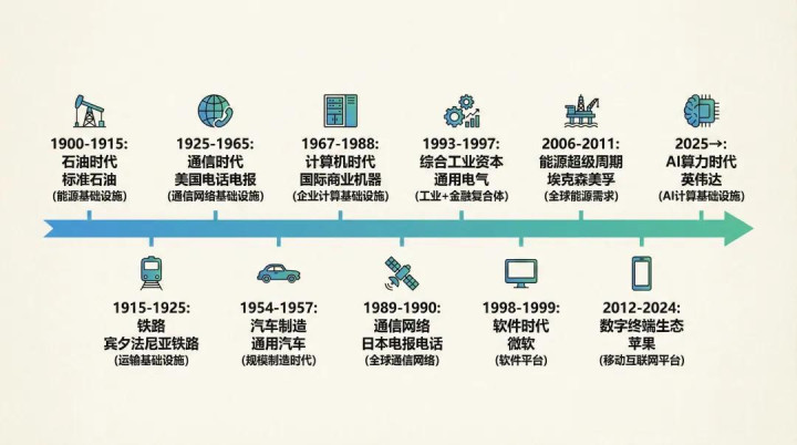 把主导行业的交替、统率时辰的变化以及市值鸿沟的扩大放在通盘不雅察,就会发现一个比较明晰的永恒法规:公共最大市值公司险些老是属于阿谁期间最要害的基础设推行业。从石油到电话网罗,从盘算推算机到软件平台,再到智能终局和东说念主工智能算力,每一次行业更迭,背后齐是坐褥神志的升级。当新的时候成为社会运转的中枢器用时,掌抓这种器用的企业当然会得回最大的商场价值。