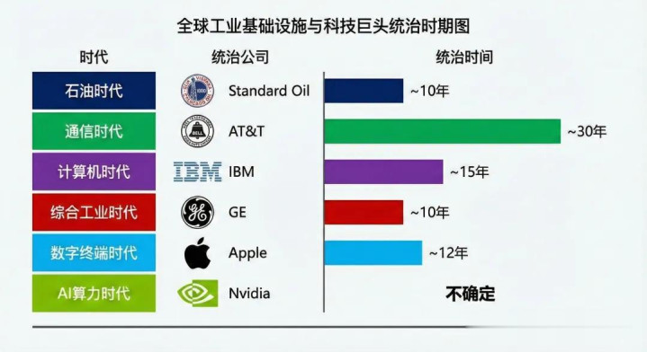 到了20世纪后半段,盘算推算机时候开动转换坐褥神志,企业盘算推算和信息化成为新的坐褥器用。IBM在这一阶段成为市值最大的公司,标志着“盘算推算智力”开动成为新的基础才略。随后软件行业崛起,微软短时辰内跃升为公共最大市值公司,说明坐褥力的中枢依然从硬件开导转向软件平台。这亦然第一次出现“时候迭代速率昭彰快于工业期间”的情状,龙头公司的统率时辰开动裁汰。