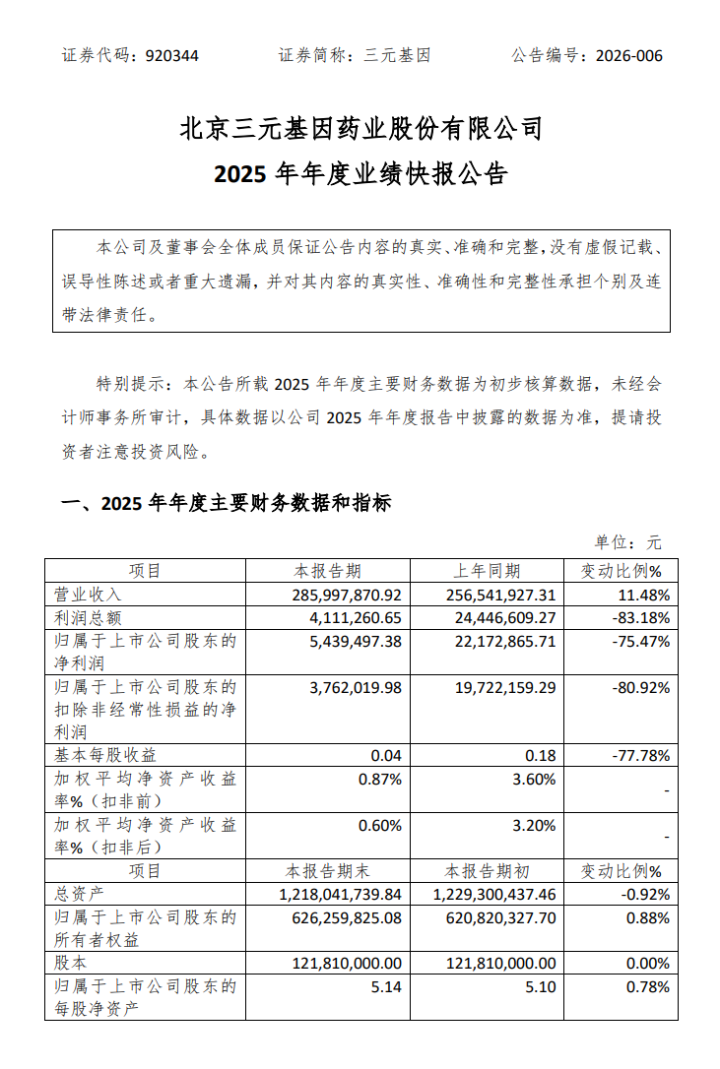 2月12日,三元基因(920344.BJ)表露2025年年度事迹快报,全年贸易收入2.86亿元,上年同期2.57亿元,同比增长11.48%;利润总和411.13万元,上年同期2444.66万元,同比下落83.18%;包摄于上市公司股东的净利润543.95万元,上年同期2217.29万元,同比下落75.47%;包摄于上市公司股东的扣除绝顶常性损益的净利润376.20万元,上年同期1972.22万元,米兰同比下落80.92%;基本每股收益0.04元,上年同期0.18元,同比下落77.78%。