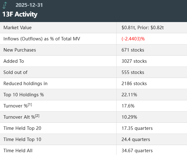 据统计,高盛第四季度合手仓总市值为8100亿好意思元,上一季度总市值为8200亿好意思元,环比下降约1.22%。在第四季度的合手仓组合中,高盛新增671只个股,增合手3027只个股,清仓了555只个股。其中,前十大合手仓方针占总市值的22.11%。