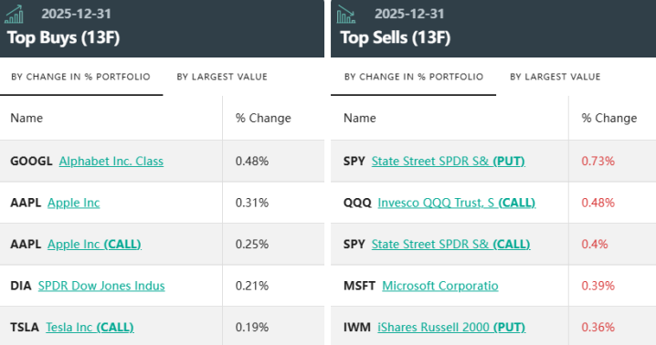 从合手仓比例变化来看,开云体育官方网站前五大买入方针分袂是:谷歌-A(GOOGL.US)、苹果(AAPL.US)、苹果看涨期权(AAPL.US,CALL)、SPDR谈琼斯指数ETF(DIA.US)、特斯拉看涨期权(TSLA.US,CALL)。