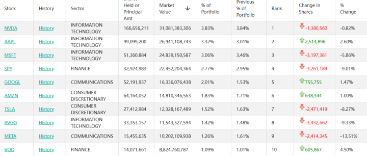 在前五大重仓方针中,英伟达(NVDA.US)位列第一,合手仓约1.67亿股,合手仓市值约310.81亿好意思元,占投资组合比例为3.83%,较上季度合手仓数目减少0.82%。