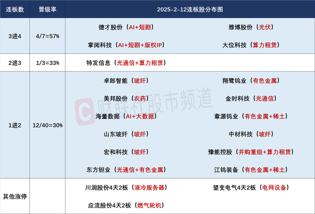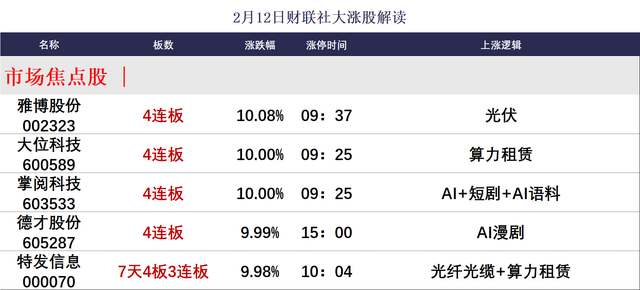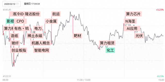 财联社2月12日讯,本日60股涨停,19股炸板,封板率为76%,大位科技、德才股份、掌阅科技、雅博股份4连板,特发信息7天4板。三大指数集体收涨,创业板指、科创50指数均涨超1%。大小指数分化,微盘股指数跌超1%。沪深两市成交额2.14万亿,较上一个走动日放量1575亿。全市集超3200只个股着落。板块方面,算力租出、电网确立、液冷就业器、小金属板块领涨;影视、食物饮料、旅游旅社、零卖板块领跌。肆意收盘,沪指涨0.05%,深成指涨0.86%,创业板指涨1.32%。