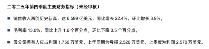 笔据裸露,华虹公司2025年第四季度销售收入达6.599亿好意思元,同比增长22.4%,环比增长3.9%。当季毛利率13%,同比高潮1.6个百分点,环比着落0.5个百分点。利润方面,当季母公司领有东谈主应占利润为1750万好意思元,上年同时为赔本2520万好意思元。