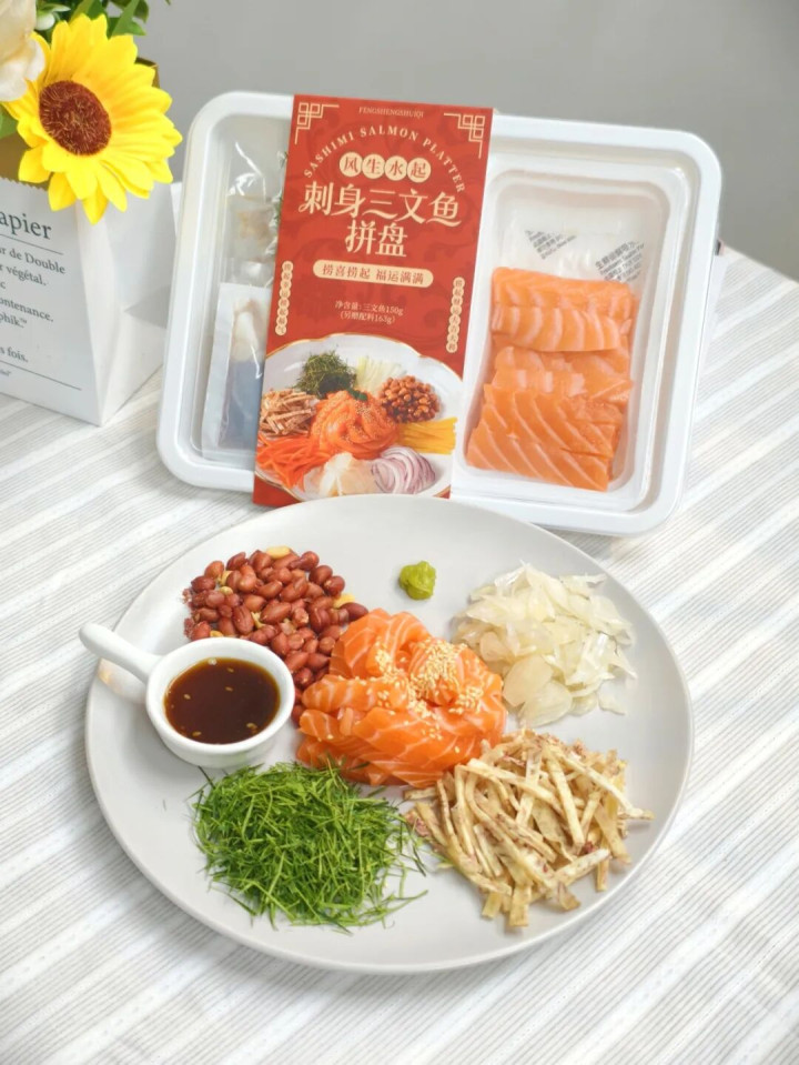 比如,近期在平台上线的“三文鱼申明鹊起鱼生拼盘”,把三文鱼切片作念成搭配8种配料的组合,口感更丰富,也借“捞起”的寓意去贴合年节需求。