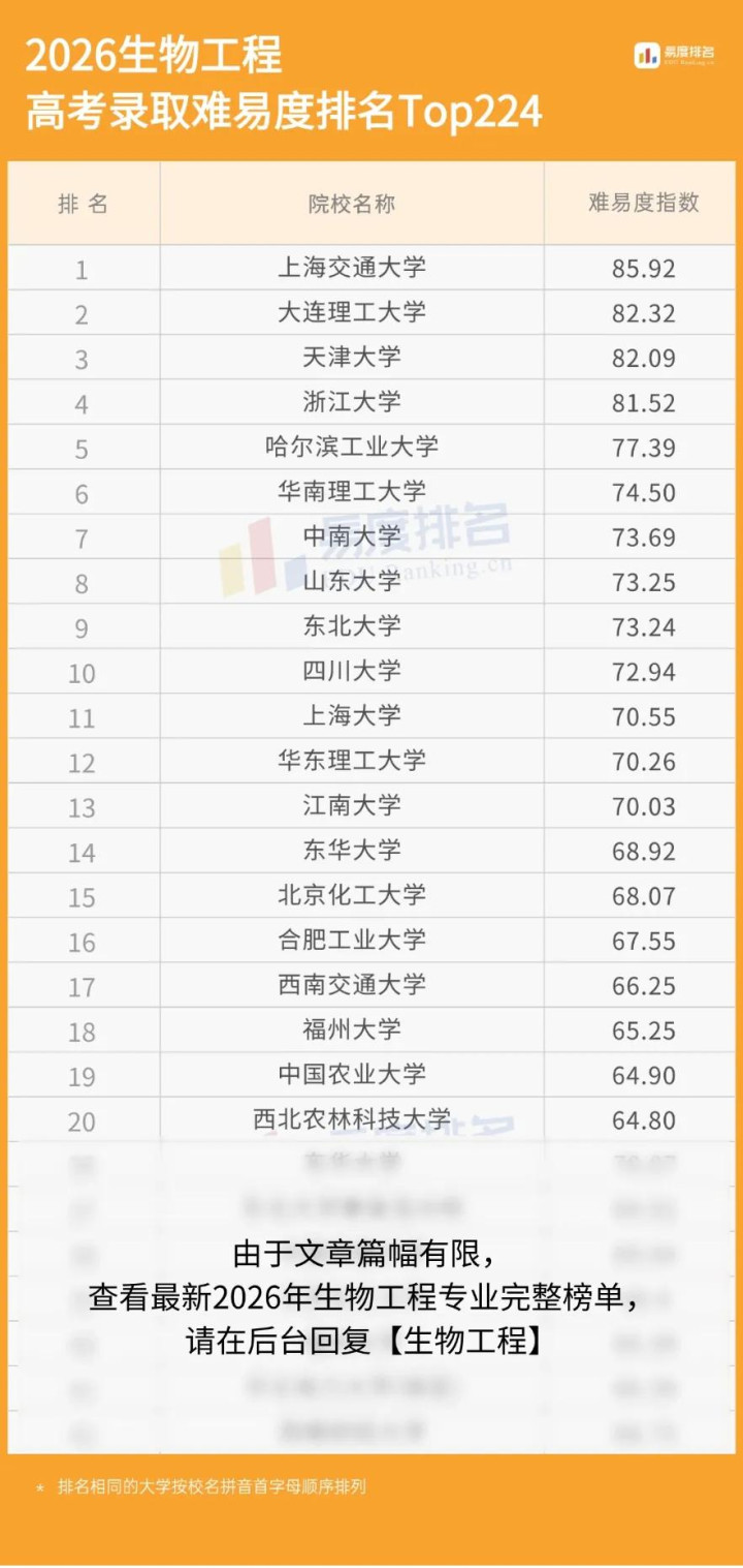 生物工程专科高度依赖实验平台和产业资源,选对院校就等于收效了一半,这里为大家保举两类值得关怀的院校,可凭据自要素数和需求聘请,顶尖强校方面,华东理工大学和北京化工大学的生物工程学科在第五轮学科评估中均获评A+,号称国内生物工程范围的天花板,专科实力和科研资源齐处于朝上水平;特质强校则有江南大学,其发酵工程标的在世界名依次一,极具专科特质,此外上海交通大学、天津大学、华南理工大学的生物工程专科也实力浑朴,且细腻贴合产业发展,毕业生在职业时更具上风,能快速对接行业需求。
