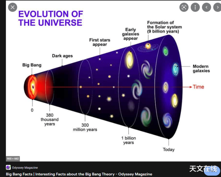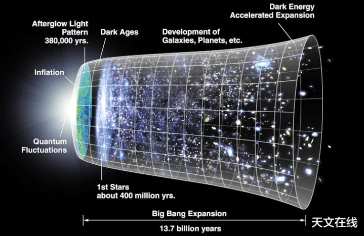 咱们咫尺对于天地历史的表面。左侧是大要140亿年前的大爆炸。天地的结构和组成随工夫发生了变化。 好意思国国度航空航天局威尔金森微波各向异性探伤器科学团队