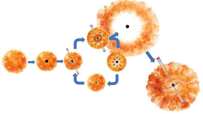 超巨星自调控坍缩星模子表露图:在中间阶段,伽马暴的前身星参加“快速吸积—强放射/外流制动—吸积减慢—制动消弱—再次吸积”的轮回反复进行,造成自若的自调控机制。图据中国科学院高能物理所