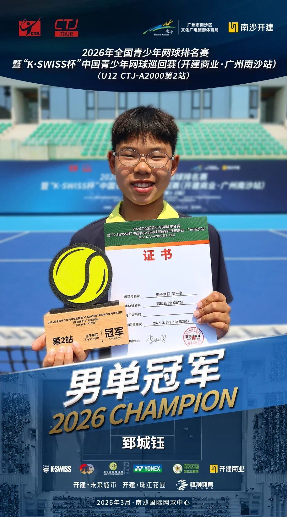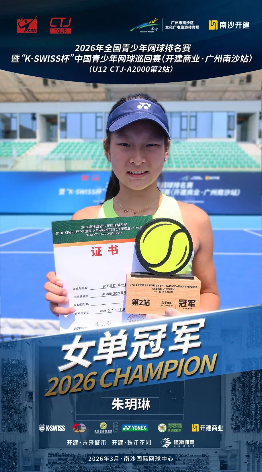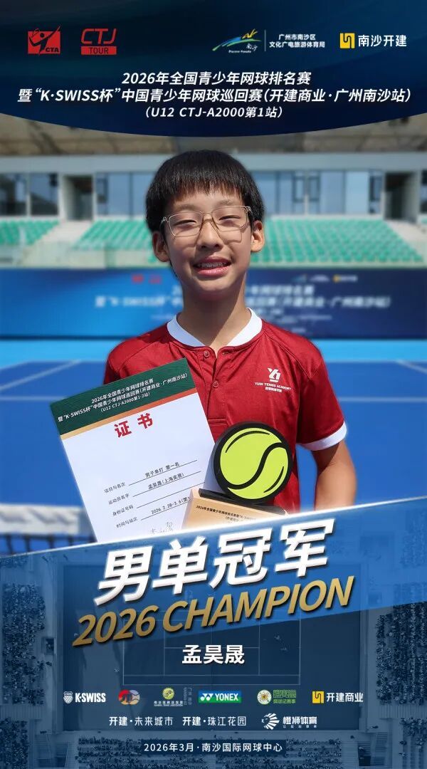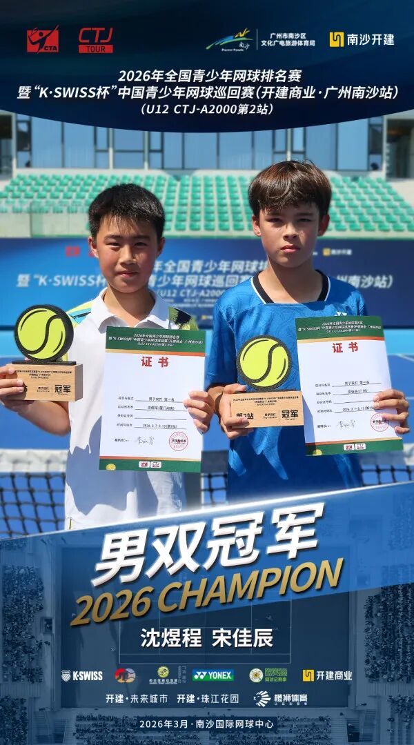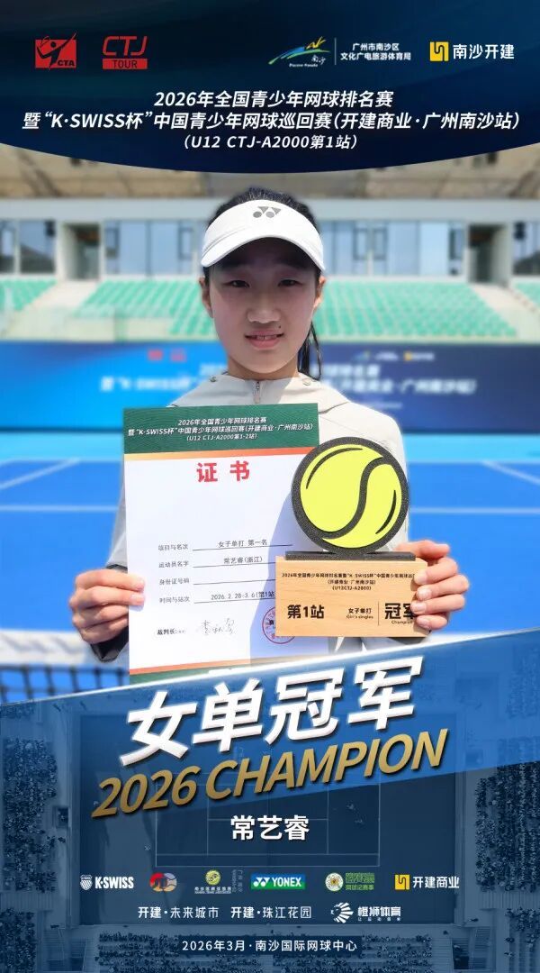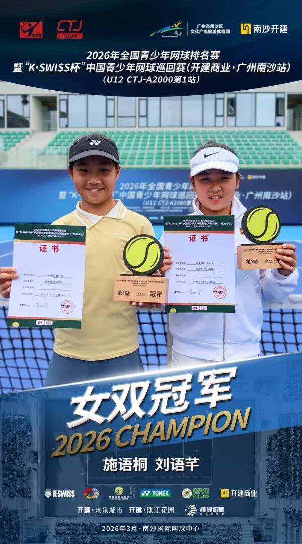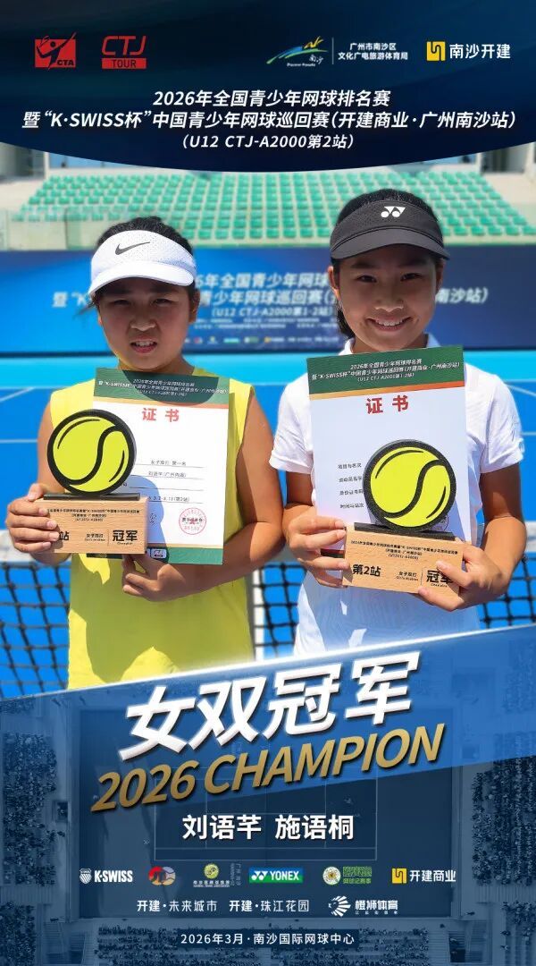 3月13日上昼,过程为期两周、702场比赛的强烈角逐,2026年宇宙青少年网球排行赛暨“K·SWISS杯”中国青少年网球巡回赛(开建交易·广州南沙站)在南沙海外网球中心圆满落下帷幕,齐集两站比赛的男单、男双、女单和女双总计八项冠军各归其主。其中,施语桐收货两冠两亚,成为本次赛事进展最为拉风的选手。