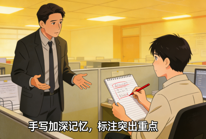 我还会让新东说念主拿条记本手写纪录,不提议他们光用手机记。手机记的本体容易被刷走,也容易分神,而手写的过程自己即是牵记的过程,新东说念主边听边写,能更快收拢重心。我还会在清单上用红笔标注出中枢信息,比如探员观念画星,救急鸠合电话画圈,让新东说念主一眼就能看到关节本体。