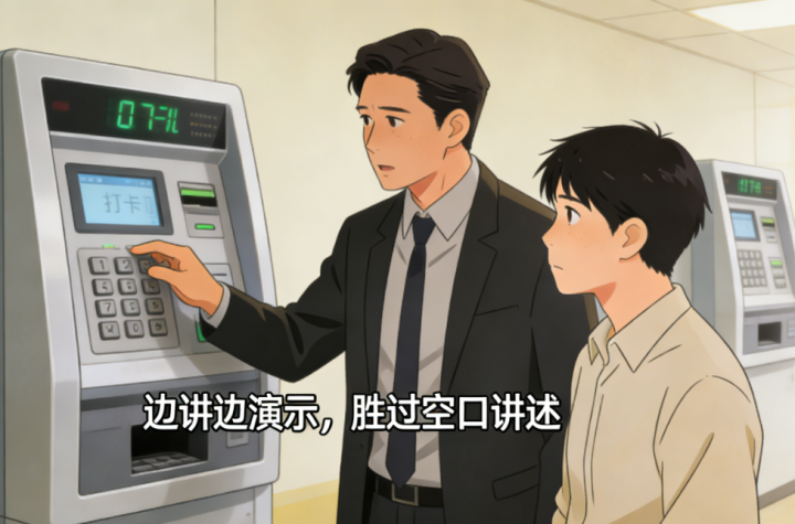 光说还不够,一定要边讲边演示,这是让新东说念主快速领路的关节。讲打卡轨则,就带着新东说念主到前台打卡机那实操一遍;讲飞书审批,就大开我方的飞书,一步步教新东说念主如何发起请假历程;讲云盘使用,就大开电脑,带着新东说念主找对应的文献夹,教他如何保存、如何分享文献。实操一遍,比说十句都管用。