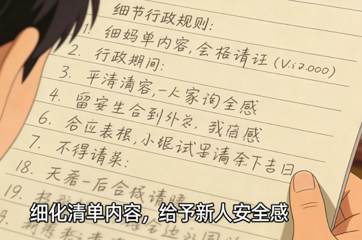 清单里的本体不行写得朦胧,必须抠到具体的细节,越细新东说念主越有安全感。比如基础行政模块,我会写清打卡时辰是早 9 晚 6,迟到 10 分钟内扣半天绩效,打卡机在前台左侧,茶水间的一次性用品在第二层柜子,请假要走飞书审批,审批东说念主是我和行政主宰,审批时长不跳跃 24 小时。这些看似琐碎的小事,却是新东说念主第一天最想知说念的。